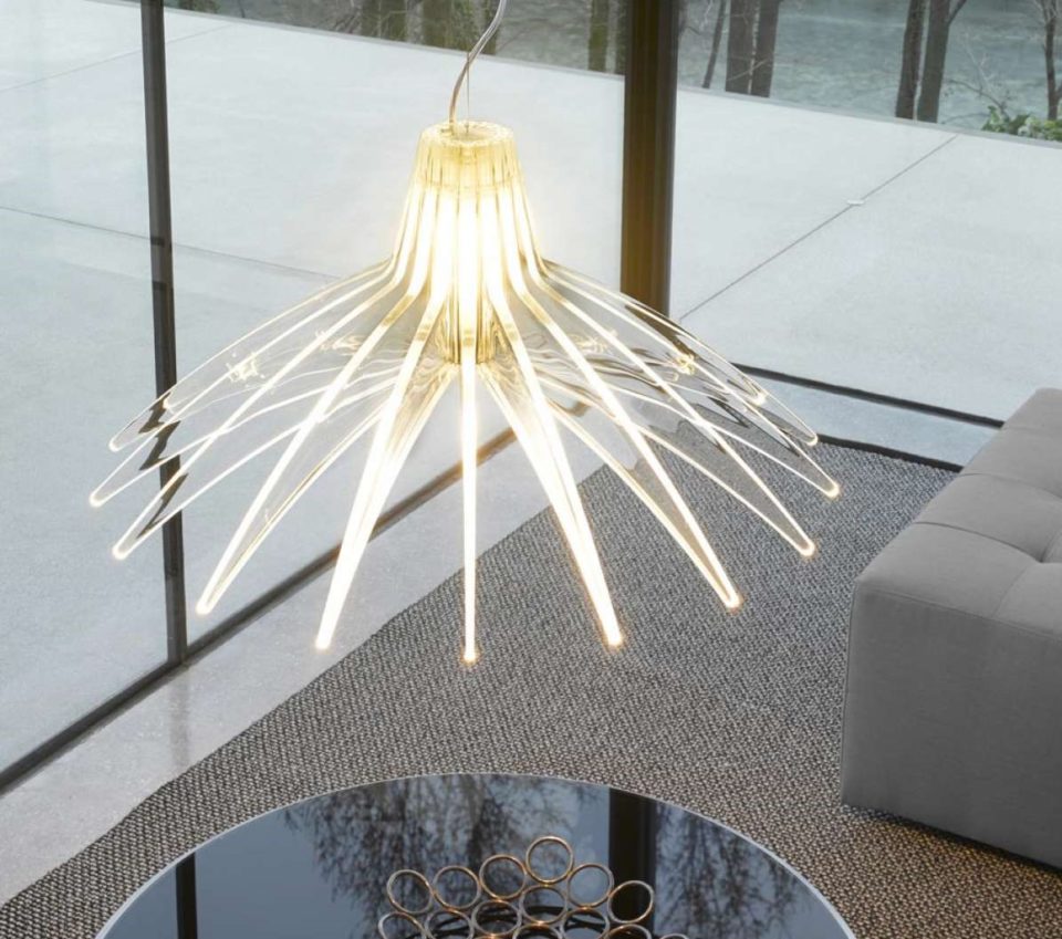 A game of transparency, reflection and refractions generates light with vivid visual impact. Three special filters can be superimposed to create chromatic effects. The radial structure of the transparent methacrylate ribs conceals the light source, preventing glare and light dispersion.
